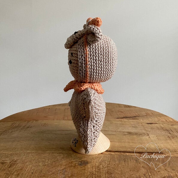 Dit Pachique sterrenbeeld is gemaakt van beige, crèmekleurige en licht oranje katoenen garen. Het sterrenbeeld staat op een houten standaard waar de naam van het sterrenbeeld op staat geschreven. Het sterrenbeeld is 17 cm hoog.