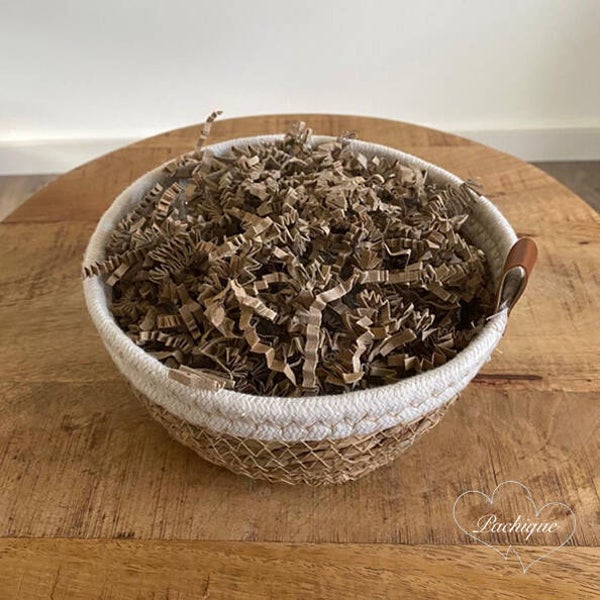 Met dit gevlochten mandje maak je zelf een leuk kraamcadeautje! Het mandje is 8 cm hoog en heeft een diameter van 18 cm.