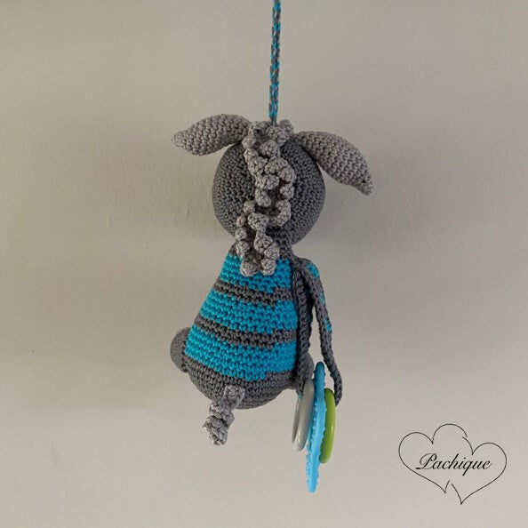 Deze Pachique knuffel in de vorm van een ezel bestaat uit grijze en blauwe katoenen garen. De ezel is 30 cm lang (inclusief haak). De ezel heeft één siliconen bijtring en twee plastic ringen (40 mm) aan zich hangen. Met de haak kan de ezel bijvoorbeeld in de kinderwagen of in de box worden opgehangen. In het lichaam van de ezel bevindt zich een rammelkraal. Hierdoor is plezier voor je baby zeker gegarandeerd!