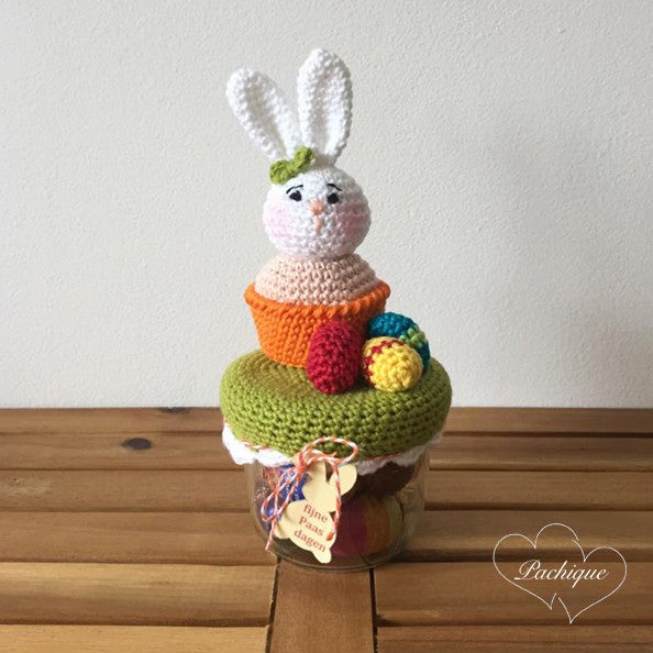 Dit unieke Pachique potje voor Pasen bestaat uit verschillende kleuren katoenen garen. Op het glazen potje zit een konijntje in een cupcake met daarnaast kleurrijke gehaakte paaseieren. In het potje zitten verschillende smaken chocolade paaseieren. Het potje heeft een diameter van 7,5 cm en is 7 cm hoog (exclusief het haakwerk).