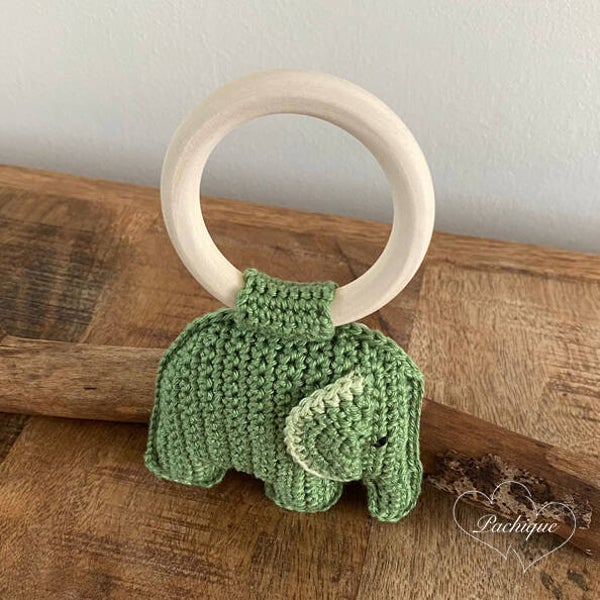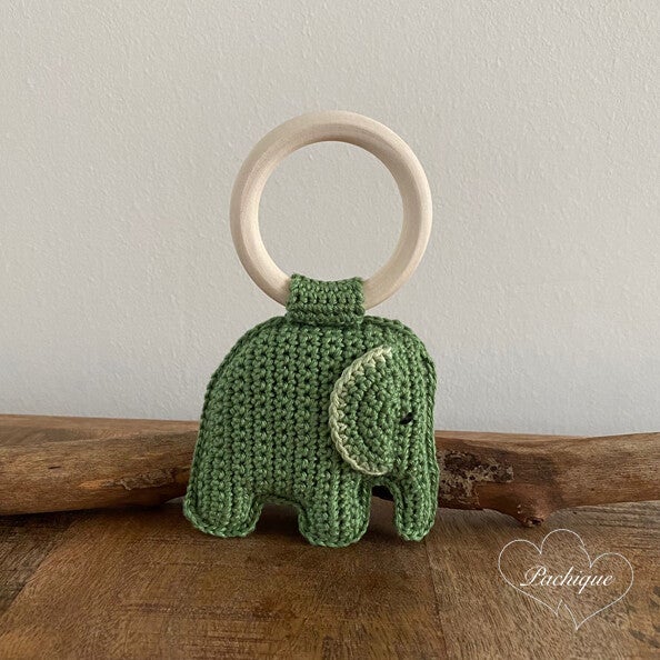 Dit Pachique speeltje in de vorm van een olifant is gemaakt van groene katoenen garen. De olifant hangt aan een houten ring (7 cm) en in het speeltje bevindt zich een pieper.