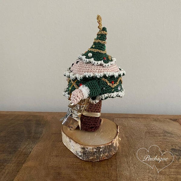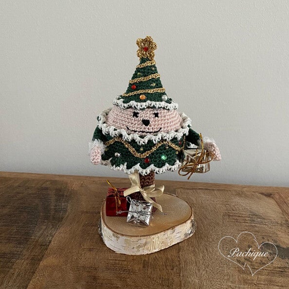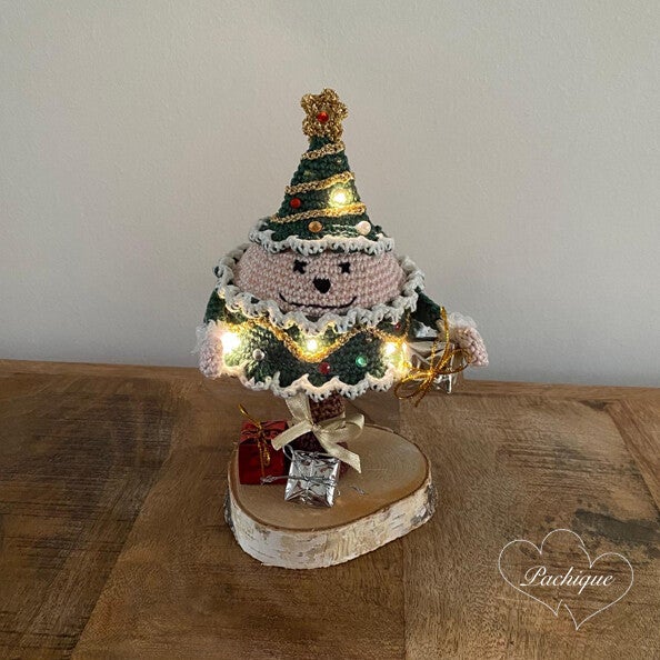 Deze leuke gehaakte Pachique kerstboom is gemaakt van groene, witte, bruine, goudkleurige en crèmekleurige katoenen garen. De kerstboom is versierd met gekleurde glitters en kopspelden. Daarnaast bevinden zich lichtjes in de kerstboom die je door middel van een knopje in de stam van de kerstboom aan en uit kan zetten. De kerstboom staat op een schijfje boomstam (diameter: 9 cm) met cadeautjes. De kerstboom is 20 cm hoog en 12 cm breed.