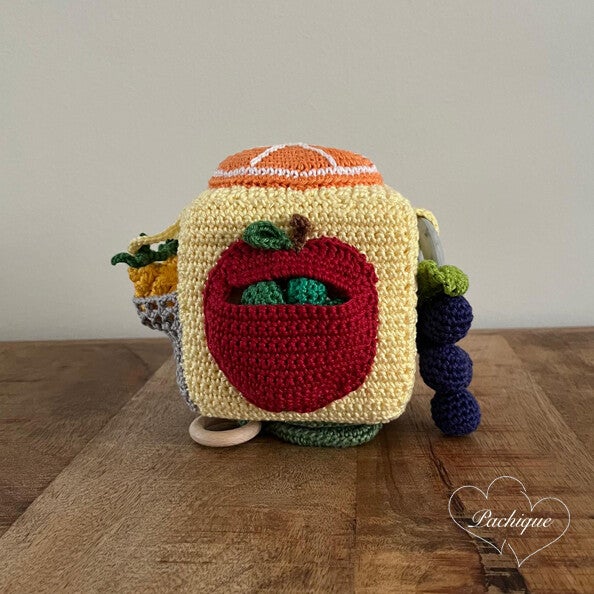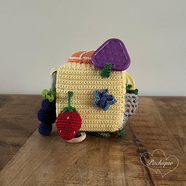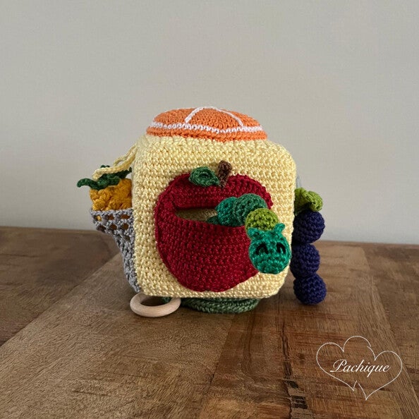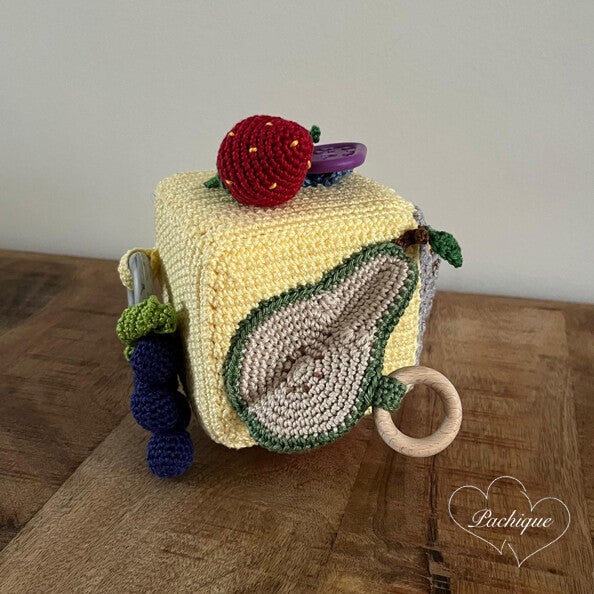 Deze Pachique zintuigen kubus met als thema 'fruit' bestaat uit veel verschillende kleuren katoenen garen. De kubus is 10 x 10 cm (exclusief attributen) en elke zijde van de kubus laat een andere fruitsoort zien: