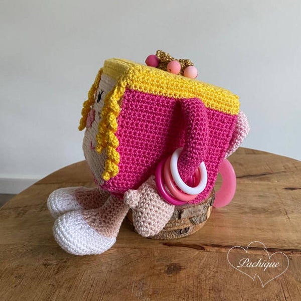Deze Pachique zintuigen kubus met een prinsessen thema bestaat uit roze, witte, goudkleurige en crèmekleurige katoenen garen. De kubus is 10 x 10 cm (exclusief attributen). De kubus bevat verschillende attributen waarmee de zintuigen gestimuleerd worden: