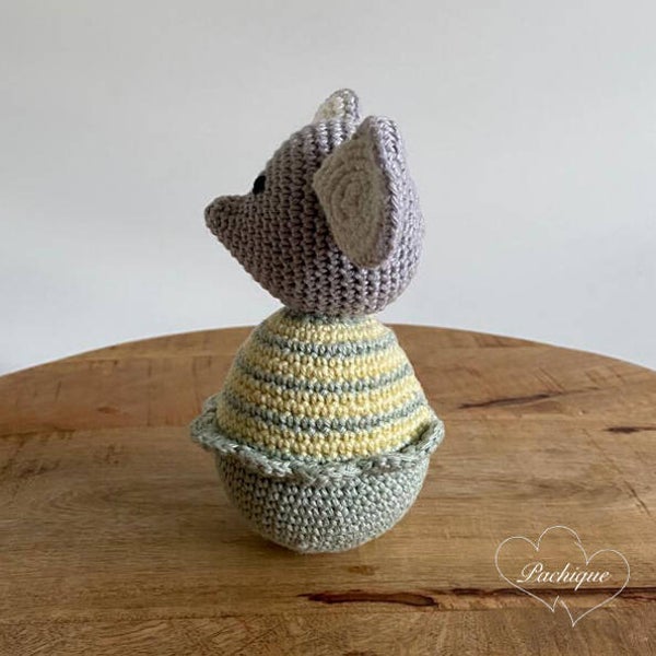 Deze Pachique tuimelaar in de vorm van een muis is gehaakt met grijze, witte, groene en gele katoenen garen. In de tuimelaar zit een tuimelbal, waardoor de muis rond tuimelt en geluid maakt. De muis is 15,5 cm hoog.