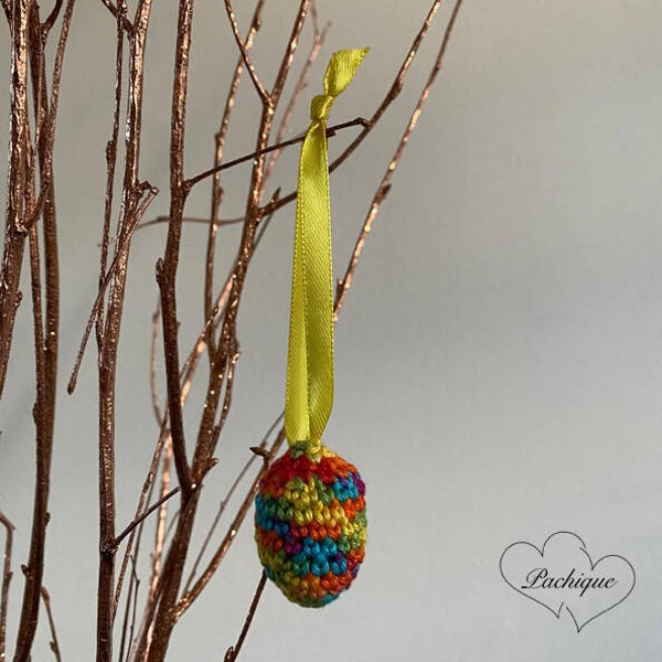 Leuke gehaakte hangers voor in de paastakken. Dit setje bestaat uit een kuiken, een schaap en twee paaseieren. De hangers zijn licht van gewicht en kunnen door middel van het gele lintje leuk in de paastakken worden opgehangen.