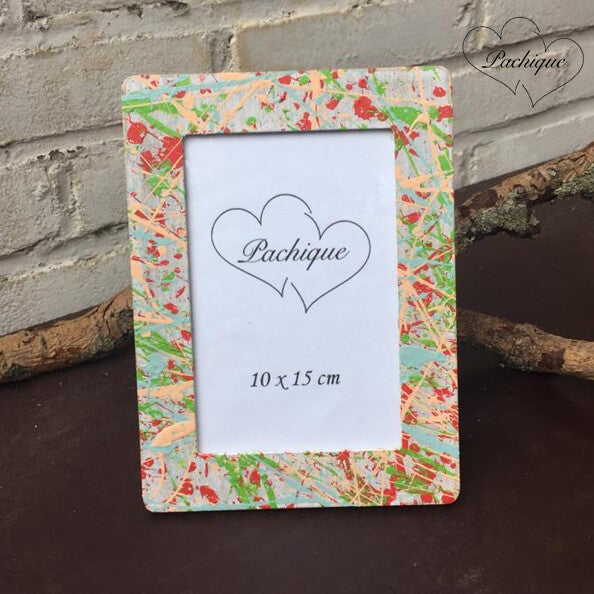Dit witte houten Pachique fotolijstje is bewerkt met verschillende kleuren verf. Een leuk en uniek lijstje! Het lijstje is geschikt voor een foto van 10 bij 15 cm.
