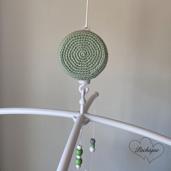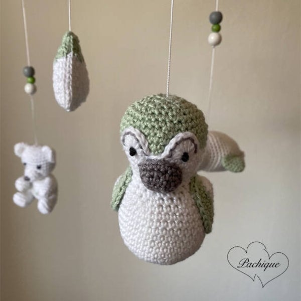 Deze Pachique baby mobiel bestaande uit pooldiertjes is gehaakt van witte, grijze, zwarte en mintgroene katoenen garen. De baby mobiel bestaat uit een ijsberg, een pinguïn, een ijsbeer, een zeehond en een poolvos. Daarnaast is de baby mobiel versierd met witte, grijze en groene houten kralen. De baby mobiel hangt aan een muziekdoosje. Wanneer je deze opwindt, draait de baby mobiel rond en speelt er een muziekje af.