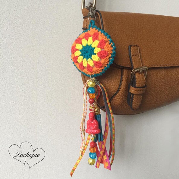 Deze Pachique tassenhanger bestaat uit diverse kleuren katoen, lintjes, kralen en een kwastje.