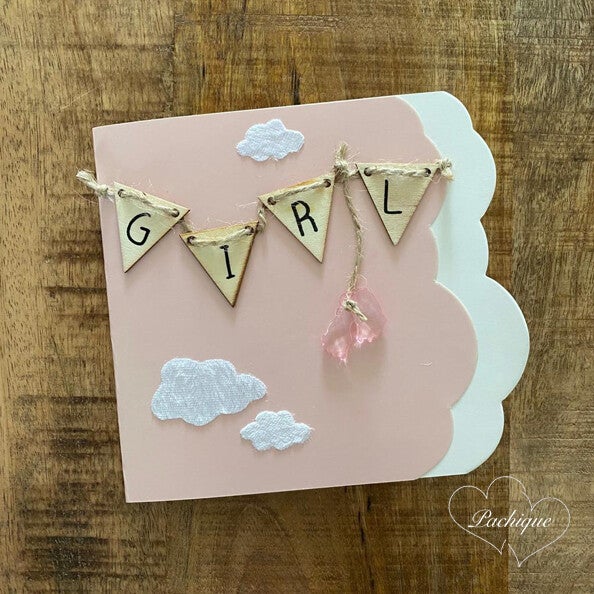 Een leuk origineel felicitatie kaartje voor de geboorte van een meisje. De binnenkant van de kaart is blanco en kan dus naar eigen wens beschreven worden.