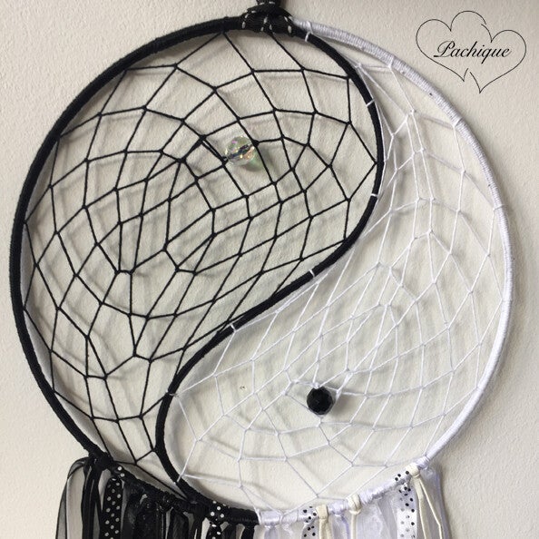 Deze Pachique Yin Yang dromenvanger (25 cm) bestaat uit zwarte en witte katoen, kralen en lintjes. Leuk voor in je slaap- of woonkamer!