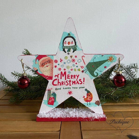 Deze Pachique kerstster is in de kleuren rood en wit geverfd en daarnaast beplakt met servetten. Aan de zijkanten hangt een rode mini kerstbal. De onderkant is versierd met nep sneeuw.