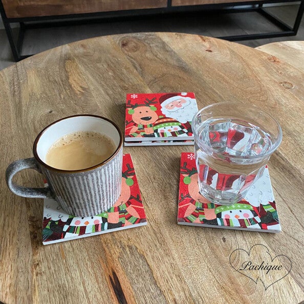 Deze Pachique houten onderzetters zijn bepakt met leuke Kerst servetten. De onderzetters zijn 10 x 10 cm. De onderkant van de onderzetter is wit en heeft vier anti-slip nopjes om te voorkomen dat de onderzetter over de tafel schuift. Het setje bestaat in totaal uit vier onderzetters.