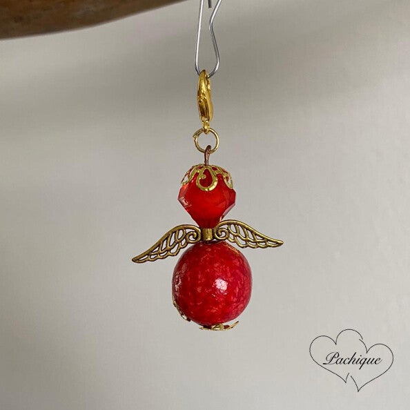 Deze Pachique beschermengel bestaat uit twee rode kralen. Het engeltje hangt aan een goudkleurig sluitinkje.