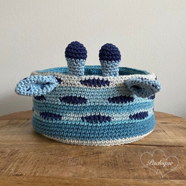 Dit leuke Pachique gehaakte mandje in de vorm van een giraf is gemaakt van verschillende blauwe katoenen garen. Het mandje is 9 cm hoog (exclusief oren en voelsprieten) en heeft een diameter van 19 cm. In het mandje ligt een losse bodem welke is gemaakt van een stof met een bijpassend patroon.