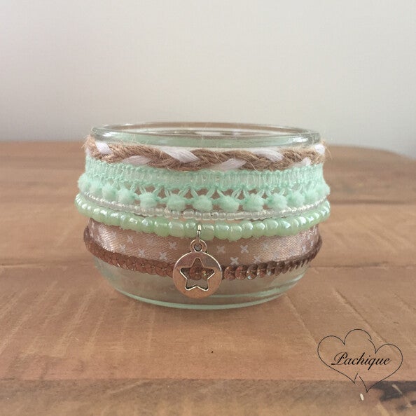 Deze Pachique theelichthouder bestaat uit een glazen potje met een diameter van 6,5 cm en een hoogte van 5 cm. Het glazen potje is versierd met bruine, witte en mintgroene lintjes en kraaltjes.