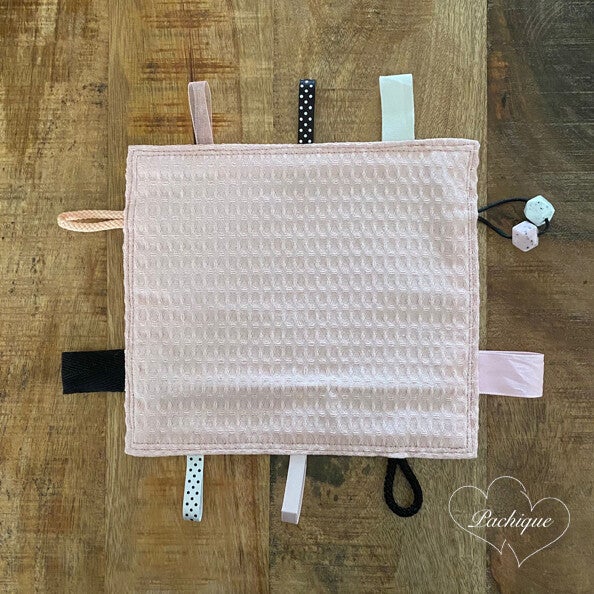 Dit Pachique zintuigendoekje is gemaakt van roze wafelstof en een stof met een patroon van regenbogen. Het doekje is 19,5 x 21,5 cm. Aan het doekje zijn lintjes van verschillende materialen en twee siliconen hexagon kralen bevestigd. Baby's worden rustig door aan de verschillende stofjes en lintjes te voelen en daarnaast worden tegelijkertijd hun zintuigen geactiveerd.