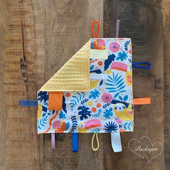Dit Pachique zintuigendoekje is gemaakt van lichtgele wafelstof en een stof met een patroon van verschillende dieren en bladeren. Het doekje is 21 x 21 cm. Aan het doekje zijn lintjes van verschillende materialen bevestigd. Baby's worden rustig door aan de verschillende stofjes en lintjes te voelen en daarnaast worden tegelijkertijd hun zintuigen geactiveerd.