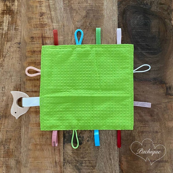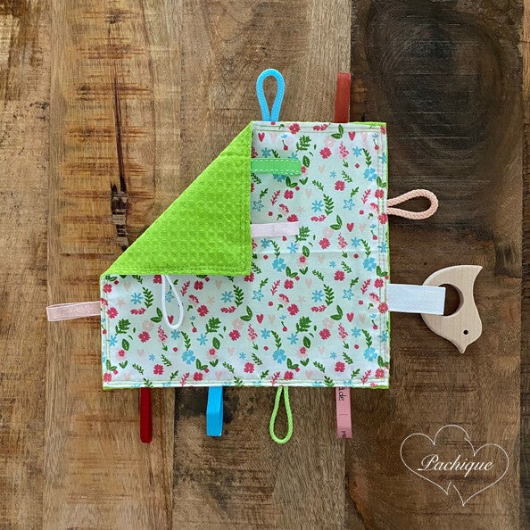 Dit Pachique zintuigendoekje is gemaakt van groene wafelstof en een witte stof met een patroon van bloemen. Het doekje is 20 x 22 cm. Aan het doekje zijn lintjes van verschillende materialen en een houten bijtring in de vorm van een vogel bevestigd. Baby's worden rustig door aan de verschillende stofjes en lintjes te voelen en daarnaast worden tegelijkertijd hun zintuigen geactiveerd.