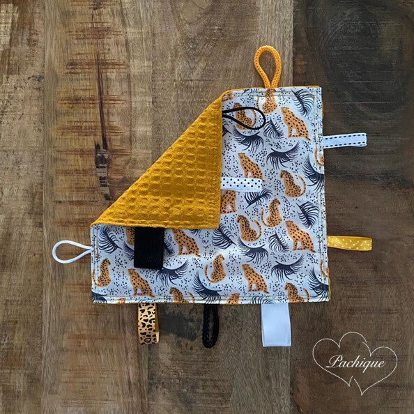 Dit Pachique zintuigendoekje is gemaakt van okergele wafelstof en een witte stof met panters. Het doekje is 21,5 x 20 cm. Aan het doekje zijn lintjes van verschillende materialen bevestigd. Baby's worden rustig door aan de verschillende stofjes en lintjes te voelen en daarnaast worden tegelijkertijd hun zintuigen geactiveerd.