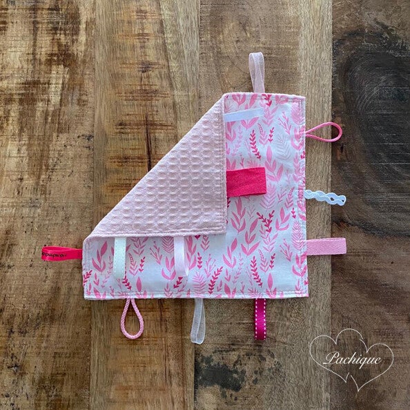 Dit Pachique zintuigendoekje is gemaakt van lichtroze wafelstof en een witte stof met een patroon van roze takken en bladeren. Het doekje is 21,5 x 20 cm. Aan het doekje zijn lintjes van verschillende materialen bevestigd. Baby's worden rustig door aan de verschillende stofjes en lintjes te voelen en daarnaast worden tegelijkertijd hun zintuigen geactiveerd.