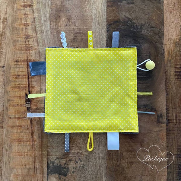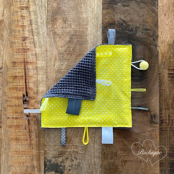 Dit Pachique zintuigendoekje is gemaakt van donkergrijze wafelstof en een gele stof met witte stippen. Het doekje is 20,5 x 19 cm. Aan het doekje zijn lintjes van verschillende materialen en een gele siliconen kraal (20 mm) bevestigd. Baby's worden rustig door aan de verschillende stofjes en lintjes te voelen en daarnaast worden tegelijkertijd hun zintuigen geactiveerd.