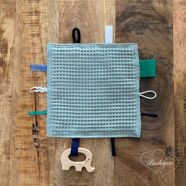 Dit Pachique zintuigendoekje is gemaakt van groengrijze wafelstof en een blauwe stof met een print van olifantjes. Het doekje is 21 x 21 cm. Aan het doekje zijn lintjes van verschillende materialen en een houten bijtring in de vorm van een olifant bevestigd. Baby's worden rustig door aan de verschillende stofjes en lintjes te voelen en daarnaast worden tegelijkertijd hun zintuigen geactiveerd.