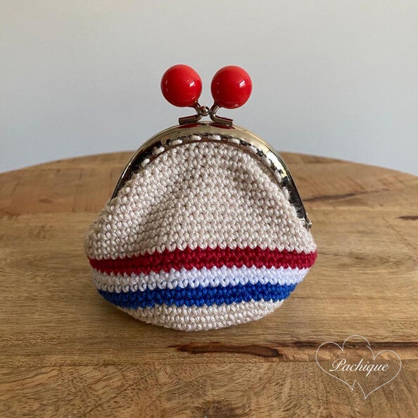 Dit Pachique gehaakte portemonneetje bestaat uit crèmekleurige, rode, blauwe en witte katoenen garen en heeft een knipsluiting.