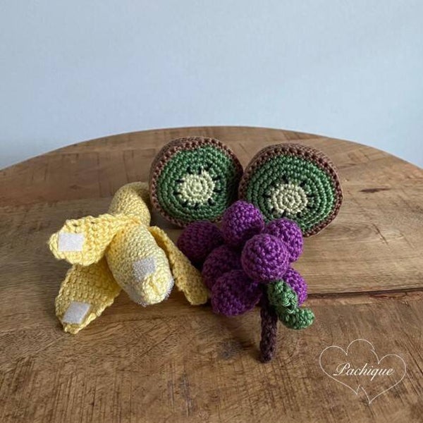 Dit Pachique fruit- en groentemandje bestaat uit een banaan, druiven, kiwi, aubergine, tomaat, wortel, groene appel, citroen en een sinaasappel. De sinaasappel en kiwi bestaan ieder uit twee helften en de banaan heeft klittenband. Hierdoor kan de schil van de banaan dicht of open gedaan worden. Het fruit en de groente zitten in een leuk rieten mandje.